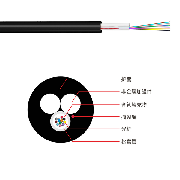 光缆结构是将ф250μm着色光纤放置在PBT松套管内,两根非金属加强件作为加强及支撑,表面挤制一层PE外护套。